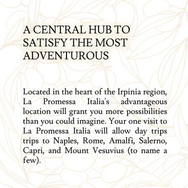A quaint network of towns surrounds you, in itself offering a lifetime's worth of discoveries. Manage to venture a little further out, though, and destinations like the Amalfi Coast and Mount Vesuvius await. La Promessa Italia has something for everyone: from the adventurer, to the curious wanderer, to those seeking respite. Whether your second day or second visit, no two stays at La Promessa will be the same.